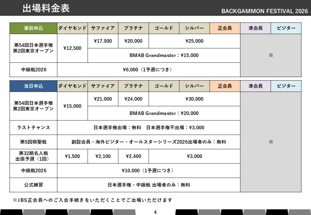 JBS会員でない方は「ビジター」料金となり、一部の大会に出場できません。